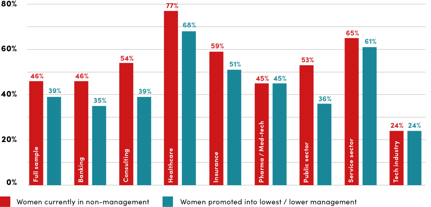 Chart: Talent pipeline by industry in Switzerland showing the proportion of women in non-management positions compared to the proportion of women at the first promotion level (Gender Intelligence Report 2025)