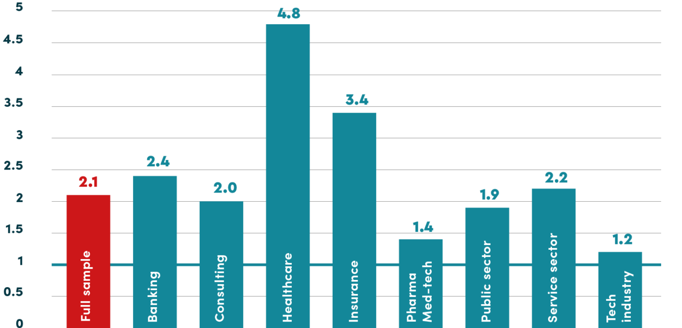 Companies that consciously focus on equal opportunities and inclusion perform significantly better on the Glass Ceiling Index* (GCI): Advance member companies have an index of 1.8. This means the glass ceiling is thinner than in the comparison group, which shows an index of 2.8. The ideal value is 1. The higher the value, the thicker the glass ceiling for women. There are also significant differences between industries: While the glass ceiling in healthcare is most pronounced with an index of 4.8 despite its high proportion of women, barriers for women to advance into management are significantly lower in pharma and tech (indices of 1.4 and 1.2, respectively).